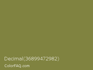Decimal 36899472982 Color is a normal yellow color and the nearest color is Old Moss Green #867e36. Hex code #808340 and RGB value is rgb(128,131,64). In RGB color space, this color is composed of 50% red, 51% green, 25% blue, In CMYK color space, this color is composed of 2% cyan, 0% magenta, 51% yellow , 49% black , In HSL color space, this color has a hue angle of 63° , 34% saturation and 38% lightness.