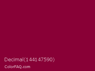 Decimal 144147590 Color is a dark rose color and the nearest color is Pink Raspberry #980036. Hex code #890036 and RGB value is rgb(137,0,54). In RGB color space, this color is composed of 54% red, 0% green, 21% blue, In CMYK color space, this color is composed of 0% cyan, 100% magenta, 61% yellow , 46% black , In HSL color space, this color has a hue angle of 336° , 100% saturation and 27% lightness.