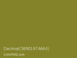 Decimal 36901974664 Color is a normal yellow color and the nearest color is Wasabi #788a25. Hex code #848528 and RGB value is rgb(132,133,40). In RGB color space, this color is composed of 52% red, 52% green, 16% blue, In CMYK color space, this color is composed of 1% cyan, 0% magenta, 70% yellow , 48% black , In HSL color space, this color has a hue angle of 61° , 54% saturation and 34% lightness.