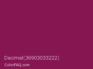 Decimal 36903033222 Color is a normal rose color and the nearest color is Disco #871550. Hex code #861652 and RGB value is rgb(134,22,82). In RGB color space, this color is composed of 53% red, 9% green, 32% blue, In CMYK color space, this color is composed of 0% cyan, 84% magenta, 39% yellow , 47% black , In HSL color space, this color has a hue angle of 328° , 72% saturation and 31% lightness.