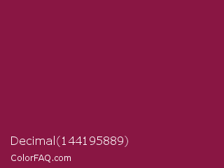 Decimal 144195889 Color is a normal rose color and the nearest color is Disco #871550. Hex code #891643 and RGB value is rgb(137,22,67). In RGB color space, this color is composed of 54% red, 9% green, 26% blue, In CMYK color space, this color is composed of 0% cyan, 84% magenta, 51% yellow , 46% black , In HSL color space, this color has a hue angle of 337° , 72% saturation and 31% lightness.