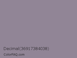 Decimal 36917384038 Color is a normal purple color and the nearest color is Venus #928590. Hex code #918596 and RGB value is rgb(145,133,150). In RGB color space, this color is composed of 57% red, 52% green, 59% blue, In CMYK color space, this color is composed of 3% cyan, 11% magenta, 0% yellow , 41% black , In HSL color space, this color has a hue angle of 282° , 7% saturation and 55% lightness.