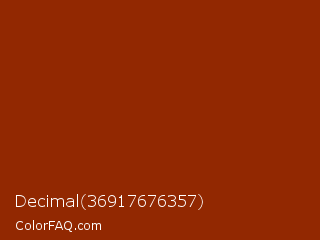 Decimal 36917676357 Color is a dark orange color and the nearest color is Totem Pole #991b07. Hex code #922801 and RGB value is rgb(146,40,1). In RGB color space, this color is composed of 57% red, 16% green, 0% blue, In CMYK color space, this color is composed of 0% cyan, 73% magenta, 99% yellow , 43% black , In HSL color space, this color has a hue angle of 16° , 99% saturation and 29% lightness.