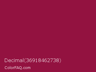 Decimal 36918462738 Color is a normal rose color and the nearest color is Vivid Burgundy #9f1d35. Hex code #931240 and RGB value is rgb(147,18,64). In RGB color space, this color is composed of 58% red, 7% green, 25% blue, In CMYK color space, this color is composed of 0% cyan, 88% magenta, 56% yellow , 42% black , In HSL color space, this color has a hue angle of 339° , 78% saturation and 32% lightness.