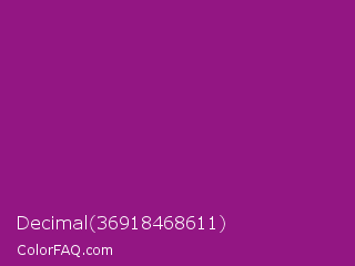 Decimal 36918468611 Color is a normal magenta color and the nearest color is Violet Eggplant #991199. Hex code #931683 and RGB value is rgb(147,22,131). In RGB color space, this color is composed of 58% red, 9% green, 51% blue, In CMYK color space, this color is composed of 0% cyan, 85% magenta, 11% yellow , 42% black , In HSL color space, this color has a hue angle of 308° , 74% saturation and 33% lightness.