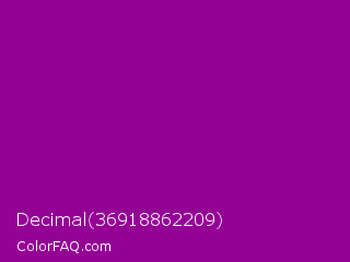 Decimal 36918862209 Color is a dark magenta color and the nearest color is Dark Magenta #8b008b. Hex code #940195 and RGB value is rgb(148,1,149). In RGB color space, this color is composed of 58% red, 0% green, 58% blue, In CMYK color space, this color is composed of 1% cyan, 99% magenta, 0% yellow , 42% black , In HSL color space, this color has a hue angle of 300° , 99% saturation and 29% lightness.