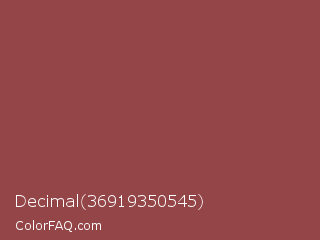 Decimal 36919350545 Color is a normal red color and the nearest color is Copper Rust #944747. Hex code #944547 and RGB value is rgb(148,69,71). In RGB color space, this color is composed of 58% red, 27% green, 28% blue, In CMYK color space, this color is composed of 0% cyan, 53% magenta, 52% yellow , 42% black , In HSL color space, this color has a hue angle of 358° , 36% saturation and 43% lightness.