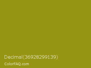 Decimal 36928299139 Color is a normal yellow color and the nearest color is Dark Yellow #9b870c. Hex code #989513 and RGB value is rgb(152,149,19). In RGB color space, this color is composed of 60% red, 58% green, 7% blue, In CMYK color space, this color is composed of 0% cyan, 2% magenta, 88% yellow , 40% black , In HSL color space, this color has a hue angle of 59° , 78% saturation and 34% lightness.