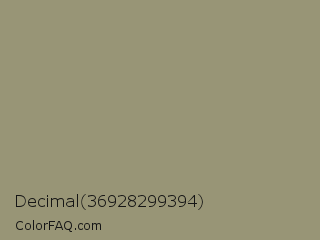 Decimal 36928299394 Color is a normal yellow color and the nearest color is Gurkha #9a9577. Hex code #989576 and RGB value is rgb(152,149,118). In RGB color space, this color is composed of 60% red, 58% green, 46% blue, In CMYK color space, this color is composed of 0% cyan, 2% magenta, 22% yellow , 40% black , In HSL color space, this color has a hue angle of 55° , 14% saturation and 53% lightness.
