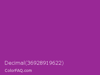 Decimal 36928919622 Color is a normal magenta color and the nearest color is Violet Eggplant #991199. Hex code #992896 and RGB value is rgb(153,40,150). In RGB color space, this color is composed of 60% red, 16% green, 59% blue, In CMYK color space, this color is composed of 0% cyan, 74% magenta, 2% yellow , 40% black , In HSL color space, this color has a hue angle of 302° , 59% saturation and 38% lightness.