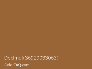 Decimal 36929033063 Color is a normal orange color and the nearest color is Coconut #965a3e. Hex code #996537 and RGB value is rgb(153,101,55). In RGB color space, this color is composed of 60% red, 40% green, 22% blue, In CMYK color space, this color is composed of 0% cyan, 34% magenta, 64% yellow , 40% black , In HSL color space, this color has a hue angle of 28° , 47% saturation and 41% lightness.