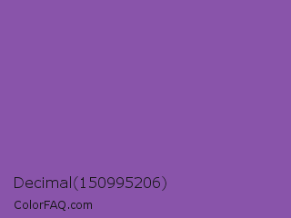 Decimal 150995206 Color is a normal purple color and the nearest color is Royal Purple #7851a9. Hex code #8954aa and RGB value is rgb(137,84,170). In RGB color space, this color is composed of 54% red, 33% green, 67% blue, In CMYK color space, this color is composed of 19% cyan, 51% magenta, 0% yellow , 33% black , In HSL color space, this color has a hue angle of 277° , 34% saturation and 50% lightness.