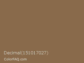Decimal 151017027 Color is a normal orange color and the nearest color is French Bistre #856d4d. Hex code #896a4b and RGB value is rgb(137,106,75). In RGB color space, this color is composed of 54% red, 42% green, 29% blue, In CMYK color space, this color is composed of 0% cyan, 23% magenta, 45% yellow , 46% black , In HSL color space, this color has a hue angle of 30° , 29% saturation and 42% lightness.