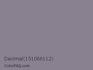 Decimal 151066112 Color is a normal purple color and the nearest color is Mamba #8e8190. Hex code #898190 and RGB value is rgb(137,129,144). In RGB color space, this color is composed of 54% red, 51% green, 56% blue, In CMYK color space, this color is composed of 5% cyan, 10% magenta, 0% yellow , 44% black , In HSL color space, this color has a hue angle of 272° , 6% saturation and 54% lightness.