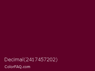 Decimal 2417457202 Color is a very dark rose color and the nearest color is Black Rose #67032d. Hex code #600128 and RGB value is rgb(96,1,40). In RGB color space, this color is composed of 38% red, 0% green, 16% blue, In CMYK color space, this color is composed of 0% cyan, 99% magenta, 58% yellow , 62% black , In HSL color space, this color has a hue angle of 335° , 98% saturation and 19% lightness.