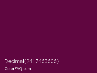 Decimal 2417463606 Color is a very dark magenta color and the nearest color is Tyrian Purple #66023c. Hex code #600640 and RGB value is rgb(96,6,64). In RGB color space, this color is composed of 38% red, 2% green, 25% blue, In CMYK color space, this color is composed of 0% cyan, 94% magenta, 33% yellow , 62% black , In HSL color space, this color has a hue angle of 321° , 88% saturation and 20% lightness.