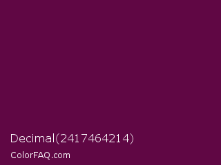 Decimal 2417464214 Color is a very dark magenta color and the nearest color is Pompadour #660045. Hex code #600744 and RGB value is rgb(96,7,68). In RGB color space, this color is composed of 38% red, 3% green, 27% blue, In CMYK color space, this color is composed of 0% cyan, 93% magenta, 29% yellow , 62% black , In HSL color space, this color has a hue angle of 319° , 86% saturation and 20% lightness.