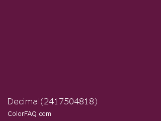 Decimal 2417504818 Color is a dark magenta color and the nearest color is Wine Berry #591d35. Hex code #601640 and RGB value is rgb(96,22,64). In RGB color space, this color is composed of 38% red, 9% green, 25% blue, In CMYK color space, this color is composed of 0% cyan, 77% magenta, 33% yellow , 62% black , In HSL color space, this color has a hue angle of 326° , 63% saturation and 23% lightness.