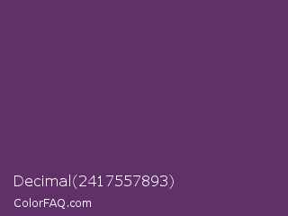 Decimal 2417557893 Color is a dark purple color and the nearest color is Imperial #602f6b. Hex code #603169 and RGB value is rgb(96,49,105). In RGB color space, this color is composed of 38% red, 19% green, 41% blue, In CMYK color space, this color is composed of 9% cyan, 53% magenta, 0% yellow , 59% black , In HSL color space, this color has a hue angle of 290° , 36% saturation and 30% lightness.
