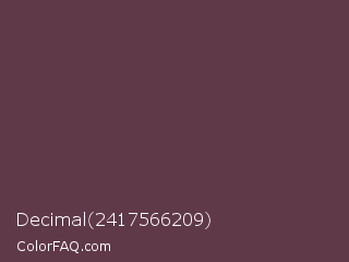 Decimal 2417566209 Color is a dark rose color and the nearest color is Eggplant #614051. Hex code #603949 and RGB value is rgb(96,57,73). In RGB color space, this color is composed of 38% red, 22% green, 29% blue, In CMYK color space, this color is composed of 0% cyan, 41% magenta, 24% yellow , 62% black , In HSL color space, this color has a hue angle of 335° , 25% saturation and 30% lightness.