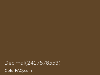 Decimal 2417578553 Color is a dark orange color and the nearest color is Van Dyke Brown #664228. Hex code #604527 and RGB value is rgb(96,69,39). In RGB color space, this color is composed of 38% red, 27% green, 15% blue, In CMYK color space, this color is composed of 0% cyan, 28% magenta, 59% yellow , 62% black , In HSL color space, this color has a hue angle of 32° , 42% saturation and 26% lightness.