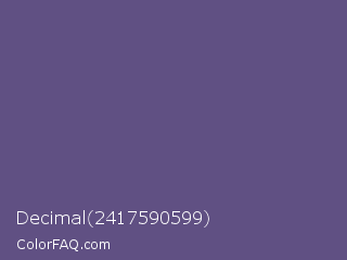 Decimal 2417590599 Color is a normal indigo color and the nearest color is Cyber Grape #58427c. Hex code #605083 and RGB value is rgb(96,80,131). In RGB color space, this color is composed of 38% red, 31% green, 51% blue, In CMYK color space, this color is composed of 27% cyan, 39% magenta, 0% yellow , 49% black , In HSL color space, this color has a hue angle of 259° , 24% saturation and 41% lightness.