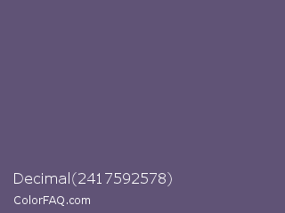 Decimal 2417592578 Color is a normal violet color and the nearest color is Smoky #605b73. Hex code #605376 and RGB value is rgb(96,83,118). In RGB color space, this color is composed of 38% red, 33% green, 46% blue, In CMYK color space, this color is composed of 19% cyan, 30% magenta, 0% yellow , 54% black , In HSL color space, this color has a hue angle of 262° , 17% saturation and 39% lightness.
