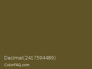 Decimal 2417594489 Color is a dark yellow color and the nearest color is Donkey Brown #664c28. Hex code #605427 and RGB value is rgb(96,84,39). In RGB color space, this color is composed of 38% red, 33% green, 15% blue, In CMYK color space, this color is composed of 0% cyan, 13% magenta, 59% yellow , 62% black , In HSL color space, this color has a hue angle of 47° , 42% saturation and 26% lightness.