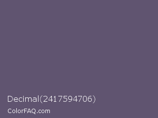 Decimal 2417594706 Color is a normal violet color and the nearest color is Smoky #605b73. Hex code #605470 and RGB value is rgb(96,84,112). In RGB color space, this color is composed of 38% red, 33% green, 44% blue, In CMYK color space, this color is composed of 14% cyan, 25% magenta, 0% yellow , 56% black , In HSL color space, this color has a hue angle of 266° , 14% saturation and 38% lightness.