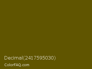 Decimal 2417595030 Color is a very dark yellow color and the nearest color is Saratoga #555b10. Hex code #605500 and RGB value is rgb(96,85,0). In RGB color space, this color is composed of 38% red, 33% green, 0% blue, In CMYK color space, this color is composed of 0% cyan, 11% magenta, 100% yellow , 62% black , In HSL color space, this color has a hue angle of 53° , 100% saturation and 19% lightness.