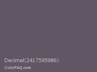 Decimal 2417595986 Color is a normal purple color and the nearest color is Scarpa Flow #585562. Hex code #605664 and RGB value is rgb(96,86,100). In RGB color space, this color is composed of 38% red, 34% green, 39% blue, In CMYK color space, this color is composed of 4% cyan, 14% magenta, 0% yellow , 61% black , In HSL color space, this color has a hue angle of 283° , 8% saturation and 36% lightness.