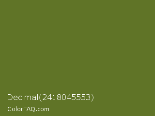 Decimal 2418045553 Color is a dark lime color and the nearest color is Fern Frond #657220. Hex code #607427 and RGB value is rgb(96,116,39). In RGB color space, this color is composed of 38% red, 45% green, 15% blue, In CMYK color space, this color is composed of 17% cyan, 0% magenta, 66% yellow , 55% black , In HSL color space, this color has a hue angle of 76° , 50% saturation and 30% lightness.
