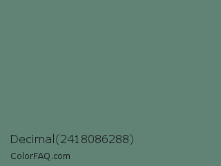 Decimal 2418086288 Color is a normal green color and the nearest color is Viridian Green #678975. Hex code #608376 and RGB value is rgb(96,131,118). In RGB color space, this color is composed of 38% red, 51% green, 46% blue, In CMYK color space, this color is composed of 27% cyan, 0% magenta, 10% yellow , 49% black , In HSL color space, this color has a hue angle of 158° , 15% saturation and 45% lightness.
