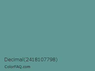 Decimal 2418107798 Color is a normal cyan color and the nearest color is Patina #639a8f. Hex code #609894 and RGB value is rgb(96,152,148). In RGB color space, this color is composed of 38% red, 60% green, 58% blue, In CMYK color space, this color is composed of 37% cyan, 0% magenta, 3% yellow , 40% black , In HSL color space, this color has a hue angle of 176° , 23% saturation and 49% lightness.