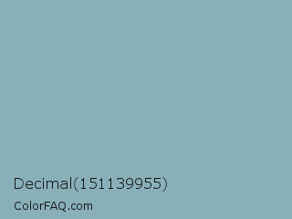 Decimal 151139955 Color is a light cyan color and the nearest color is Pewter Blue #8ba8b7. Hex code #89b0b9 and RGB value is rgb(137,176,185). In RGB color space, this color is composed of 54% red, 69% green, 73% blue, In CMYK color space, this color is composed of 26% cyan, 5% magenta, 0% yellow , 27% black , In HSL color space, this color has a hue angle of 191° , 26% saturation and 63% lightness.
