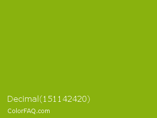 Decimal 151142420 Color is a normal lime color and the nearest color is Apple Green #8db600. Hex code #89b20e and RGB value is rgb(137,178,14). In RGB color space, this color is composed of 54% red, 70% green, 5% blue, In CMYK color space, this color is composed of 23% cyan, 0% magenta, 92% yellow , 30% black , In HSL color space, this color has a hue angle of 75° , 85% saturation and 38% lightness.