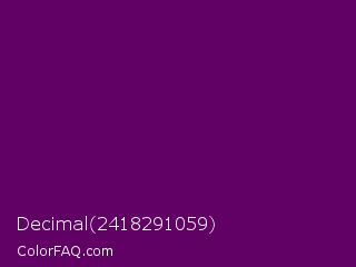 Decimal 2418291059 Color is a very dark magenta color and the nearest color is Clairvoyant #480656. Hex code #610065 and RGB value is rgb(97,0,101). In RGB color space, this color is composed of 38% red, 0% green, 40% blue, In CMYK color space, this color is composed of 4% cyan, 100% magenta, 0% yellow , 60% black , In HSL color space, this color has a hue angle of 298° , 100% saturation and 20% lightness.
