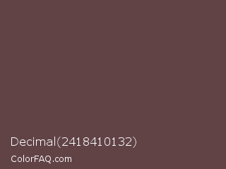 Decimal 2418410132 Color is a normal red color and the nearest color is Rose Ebony #674846. Hex code #614346 and RGB value is rgb(97,67,70). In RGB color space, this color is composed of 38% red, 26% green, 27% blue, In CMYK color space, this color is composed of 0% cyan, 31% magenta, 28% yellow , 62% black , In HSL color space, this color has a hue angle of 354° , 18% saturation and 32% lightness.