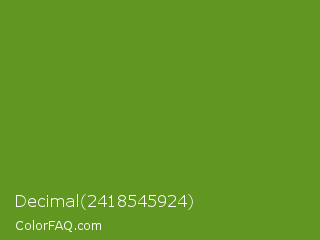 Decimal 2418545924 Color is a normal green color and the nearest color is Olive Drab #6b8e23. Hex code #619620 and RGB value is rgb(97,150,32). In RGB color space, this color is composed of 38% red, 59% green, 13% blue, In CMYK color space, this color is composed of 35% cyan, 0% magenta, 79% yellow , 41% black , In HSL color space, this color has a hue angle of 87° , 65% saturation and 36% lightness.