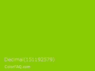 Decimal 151192579 Color is a normal green color and the nearest color is Sheen Green #8fd400. Hex code #89cb03 and RGB value is rgb(137,203,3). In RGB color space, this color is composed of 54% red, 80% green, 1% blue, In CMYK color space, this color is composed of 33% cyan, 0% magenta, 99% yellow , 20% black , In HSL color space, this color has a hue angle of 80° , 97% saturation and 40% lightness.