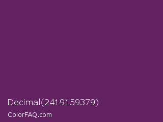 Decimal 2419159379 Color is a dark magenta color and the nearest color is Palatinate Purple #682860. Hex code #622161 and RGB value is rgb(98,33,97). In RGB color space, this color is composed of 38% red, 13% green, 38% blue, In CMYK color space, this color is composed of 0% cyan, 66% magenta, 1% yellow , 62% black , In HSL color space, this color has a hue angle of 301° , 50% saturation and 26% lightness.