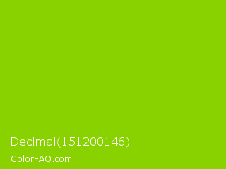 Decimal 151200146 Color is a normal green color and the nearest color is Sheen Green #8fd400. Hex code #89d200 and RGB value is rgb(137,210,0). In RGB color space, this color is composed of 54% red, 82% green, 0% blue, In CMYK color space, this color is composed of 35% cyan, 0% magenta, 100% yellow , 18% black , In HSL color space, this color has a hue angle of 81° , 100% saturation and 41% lightness.