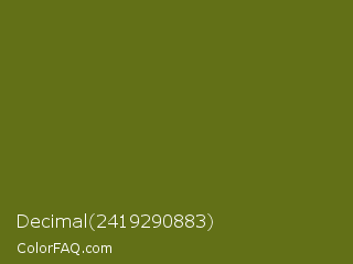 Decimal 2419290883 Color is a dark yellow color and the nearest color is Fern Frond #657220. Hex code #627017 and RGB value is rgb(98,112,23). In RGB color space, this color is composed of 38% red, 44% green, 9% blue, In CMYK color space, this color is composed of 13% cyan, 0% magenta, 79% yellow , 56% black , In HSL color space, this color has a hue angle of 69° , 66% saturation and 26% lightness.