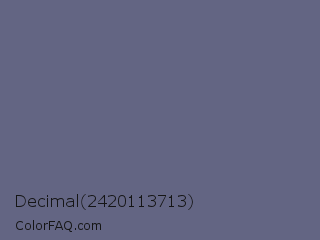 Decimal 2420113713 Color is a normal blue color and the nearest color is Dolphin #646077. Hex code #636583 and RGB value is rgb(99,101,131). In RGB color space, this color is composed of 39% red, 40% green, 51% blue, In CMYK color space, this color is composed of 24% cyan, 23% magenta, 0% yellow , 49% black , In HSL color space, this color has a hue angle of 236° , 14% saturation and 45% lightness.