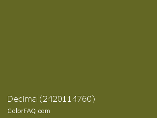 Decimal 2420114760 Color is a dark yellow color and the nearest color is Fern Frond #657220. Hex code #636724 and RGB value is rgb(99,103,36). In RGB color space, this color is composed of 39% red, 40% green, 14% blue, In CMYK color space, this color is composed of 4% cyan, 0% magenta, 65% yellow , 60% black , In HSL color space, this color has a hue angle of 64° , 48% saturation and 27% lightness.