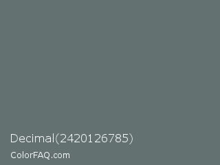 Decimal 2420126785 Color is a normal cyan color and the nearest color is Nevada #646e75. Hex code #637271 and RGB value is rgb(99,114,113). In RGB color space, this color is composed of 39% red, 45% green, 44% blue, In CMYK color space, this color is composed of 13% cyan, 0% magenta, 1% yellow , 55% black , In HSL color space, this color has a hue angle of 176° , 7% saturation and 42% lightness.