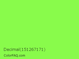 Decimal 151267171 Color is a light green color and the nearest color is Kiwi #8ee53f. Hex code #89fb4b and RGB value is rgb(137,251,75). In RGB color space, this color is composed of 54% red, 98% green, 29% blue, In CMYK color space, this color is composed of 45% cyan, 0% magenta, 70% yellow , 2% black , In HSL color space, this color has a hue angle of 99° , 96% saturation and 64% lightness.
