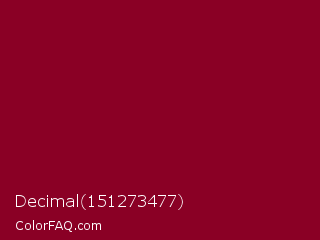 Decimal 151273477 Color is a dark rose color and the nearest color is Paprika #8d0226. Hex code #8a0025 and RGB value is rgb(138,0,37). In RGB color space, this color is composed of 54% red, 0% green, 15% blue, In CMYK color space, this color is composed of 0% cyan, 100% magenta, 73% yellow , 46% black , In HSL color space, this color has a hue angle of 344° , 100% saturation and 27% lightness.