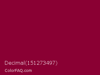 Decimal 151273497 Color is a dark rose color and the nearest color is Paprika #8d0226. Hex code #8a0033 and RGB value is rgb(138,0,51). In RGB color space, this color is composed of 54% red, 0% green, 20% blue, In CMYK color space, this color is composed of 0% cyan, 100% magenta, 63% yellow , 46% black , In HSL color space, this color has a hue angle of 338° , 100% saturation and 27% lightness.
