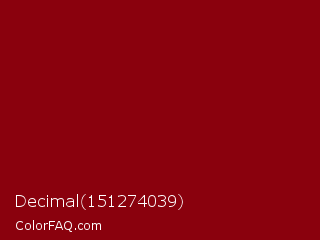 Decimal 151274039 Color is a dark red color and the nearest color is Red Devil #860111. Hex code #8a010d and RGB value is rgb(138,1,13). In RGB color space, this color is composed of 54% red, 0% green, 5% blue, In CMYK color space, this color is composed of 0% cyan, 99% magenta, 91% yellow , 46% black , In HSL color space, this color has a hue angle of 355° , 99% saturation and 27% lightness.
